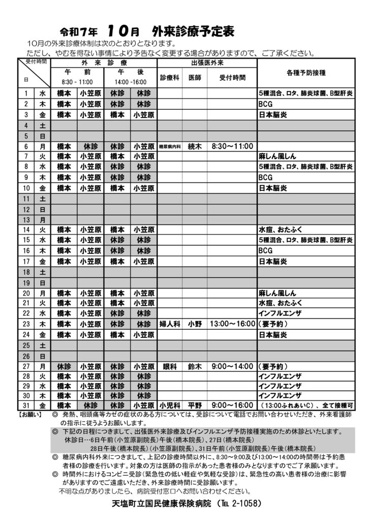 外来のご案内 外来診療体制 9 月 外来診療予定表 データをダウンロードする場合はアイコンをクリックしてください。PDF 約 158 KB 10 月 外来診療予定表 データをダウンロードする場合はアイコンをクリックしてください。PDF 約 168 KB